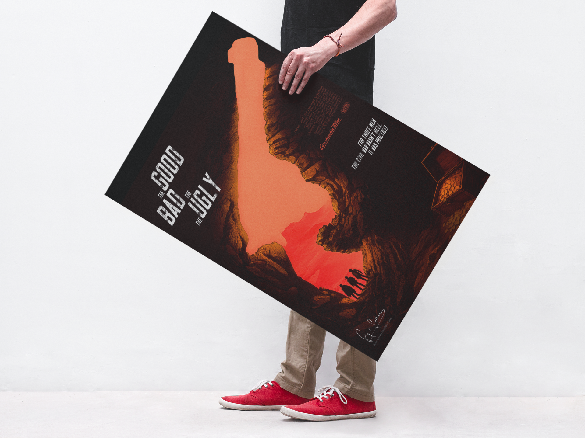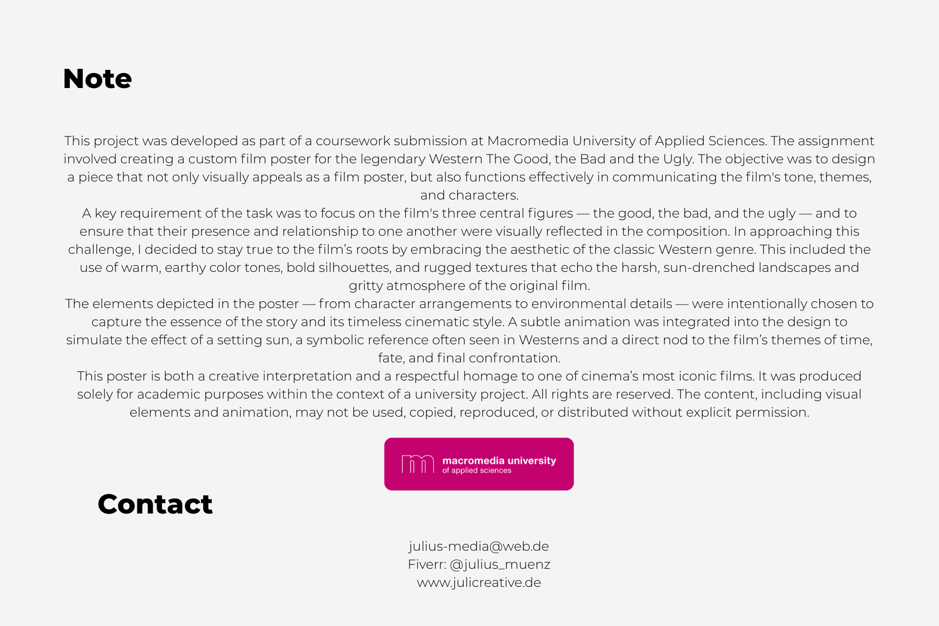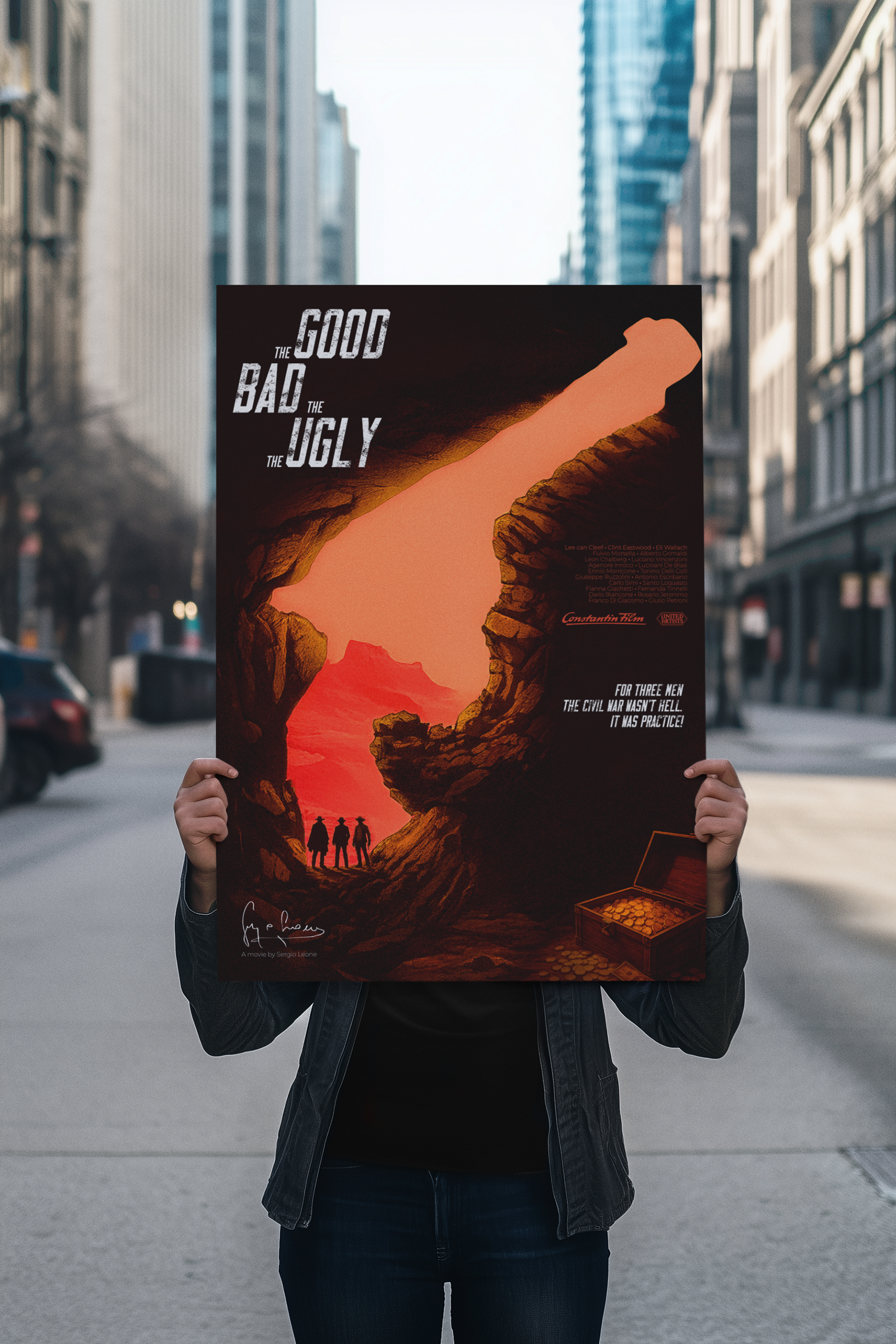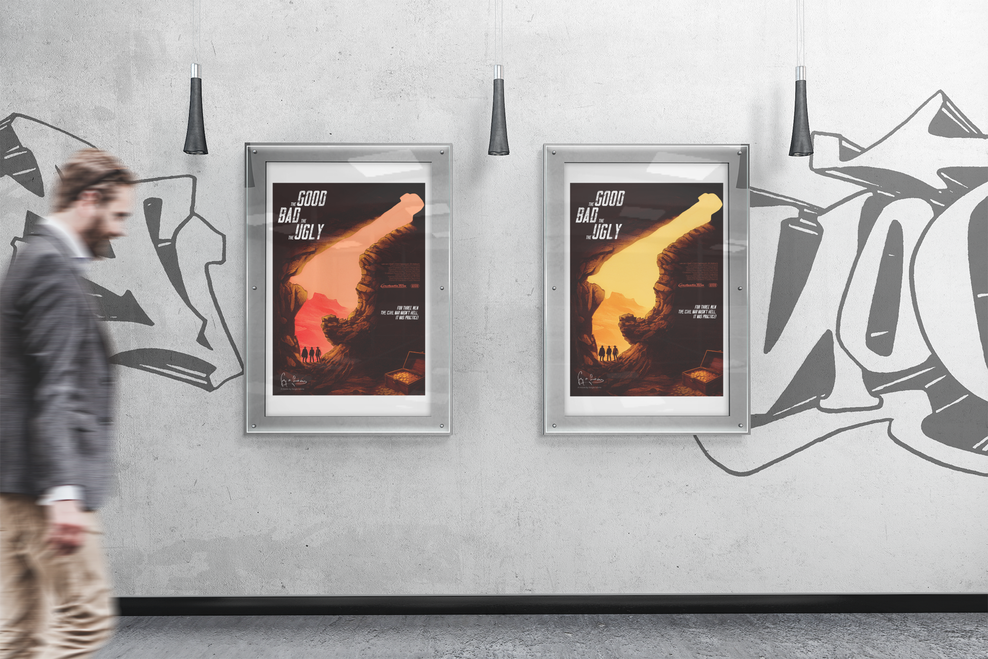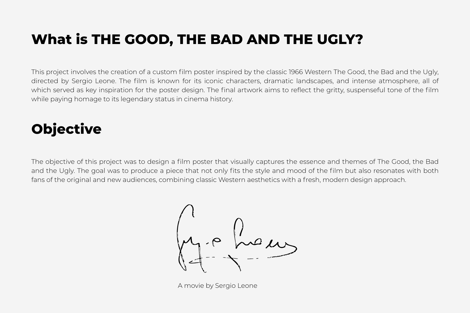 This project involved designing a film poster inspired by The Good, the Bad and the Ugly. The goal was to capture the iconic Western atmosphere and the film’s tension through bold visuals and a striking composition. The design uses a limited color palette and strong typography to evoke the gritty, dramatic tone of the classic movie, while paying homage to its legendary characters and themes.