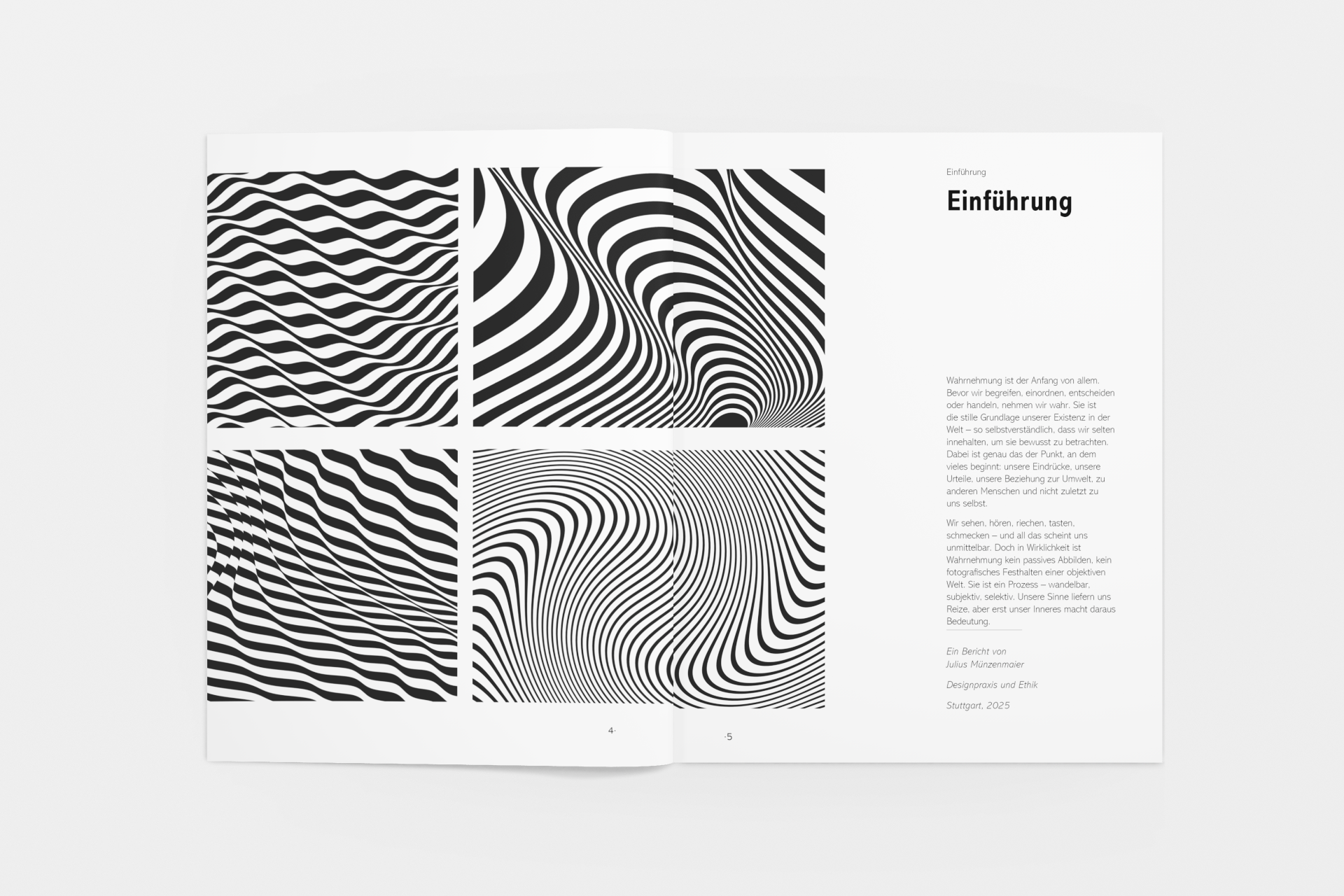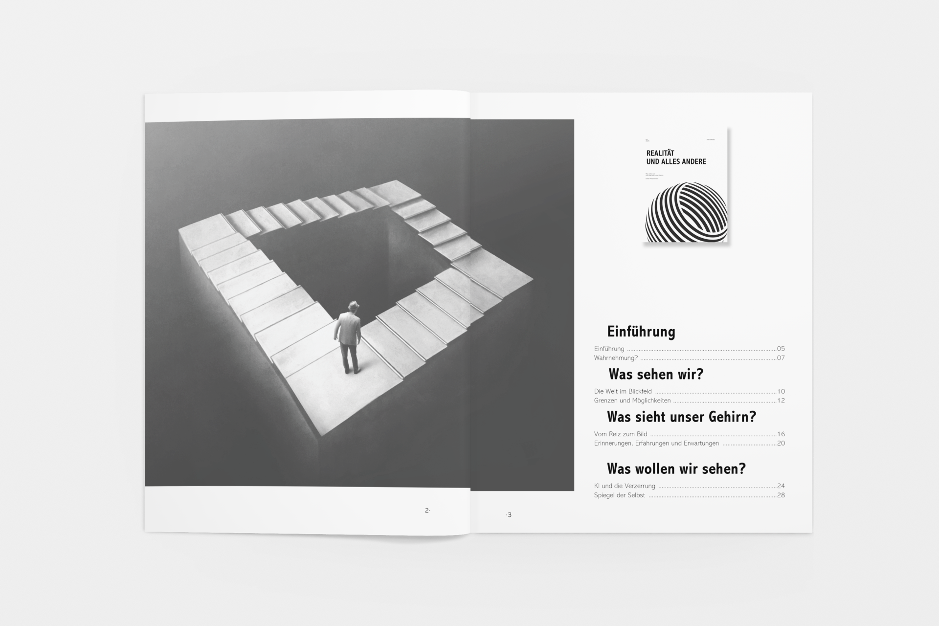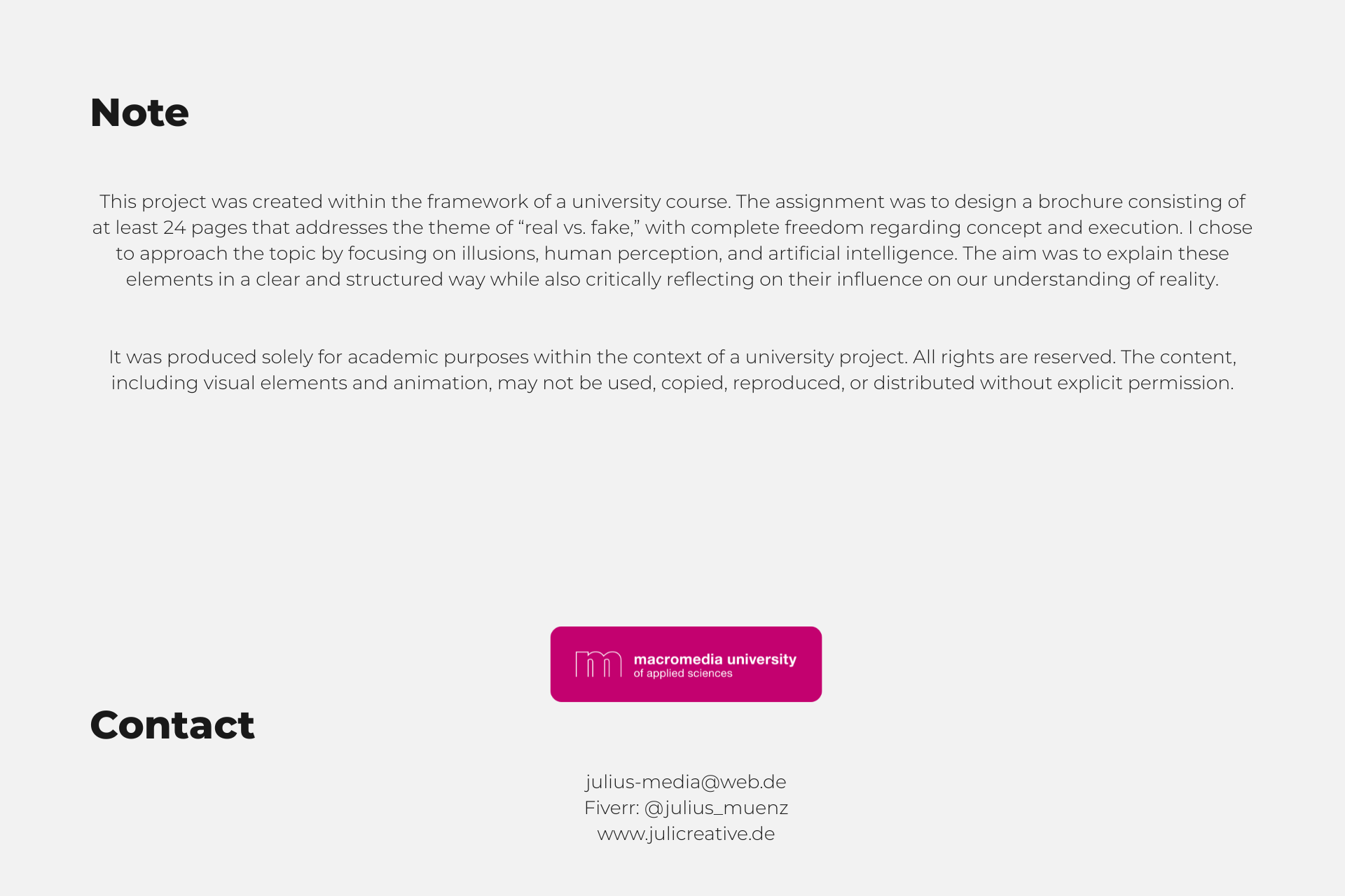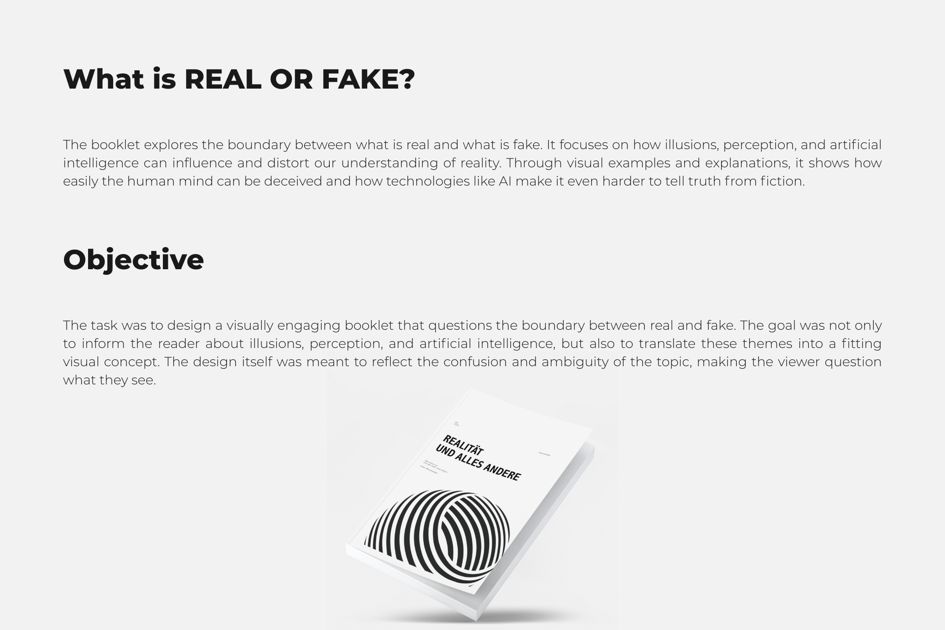This project involved designing a minimalist black-and-white booklet that explores the theme of “real vs. fake.” Through clear typography and a clean layout, the booklet addresses topics such as perception, illusions, and artificial intelligence. The goal was to create a visually engaging and thought-provoking piece that encourages readers to question their understanding of reality.