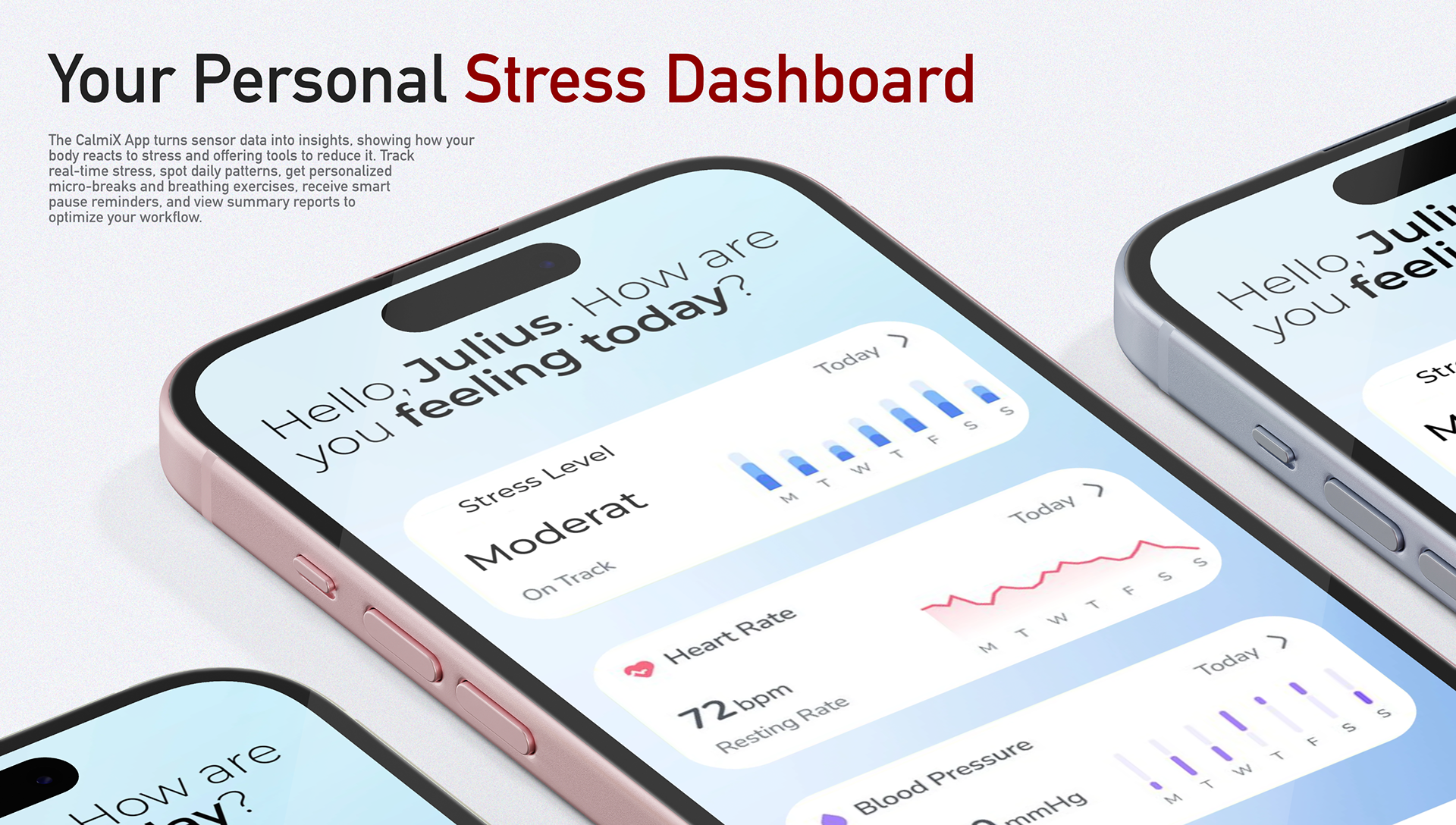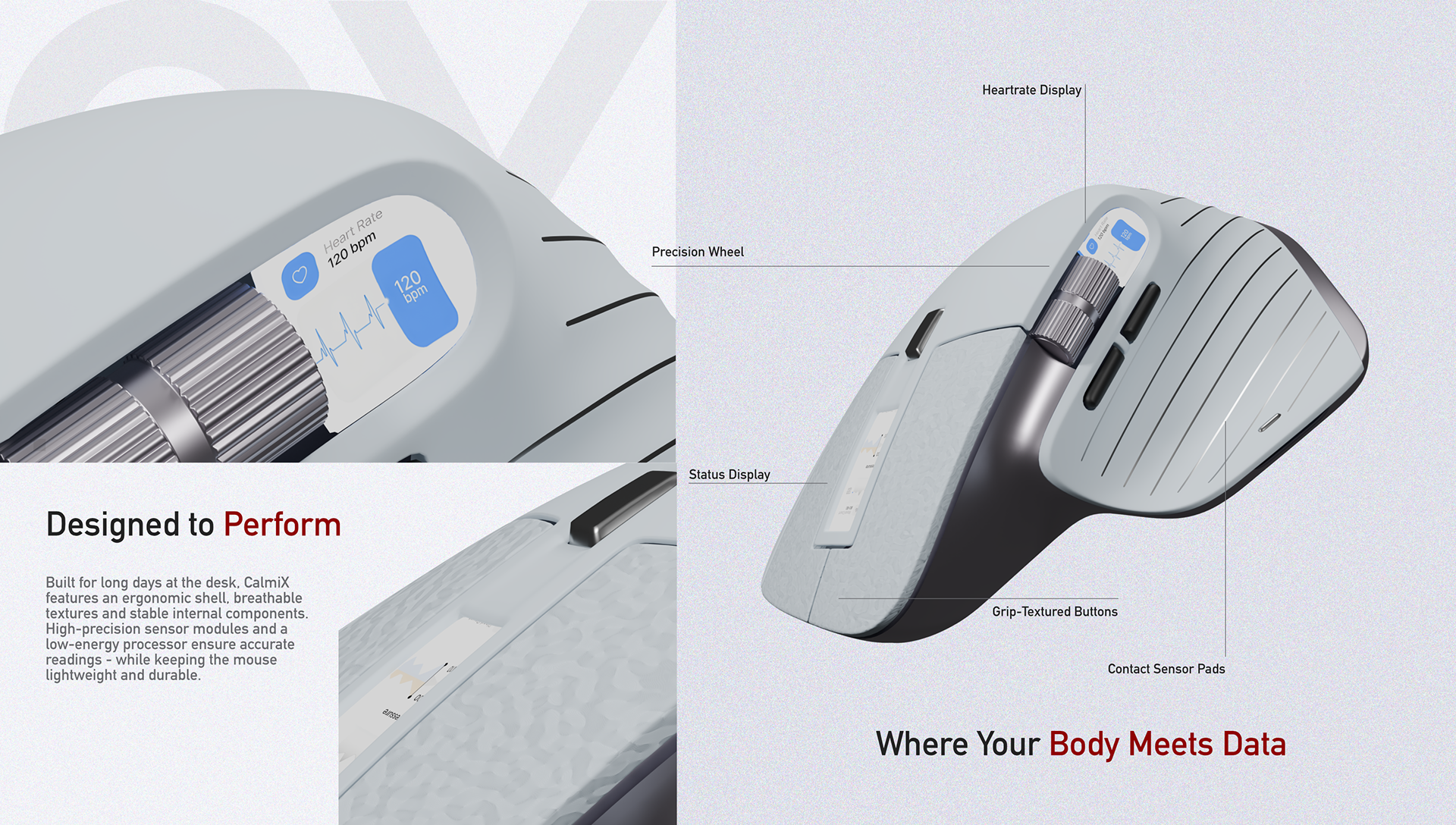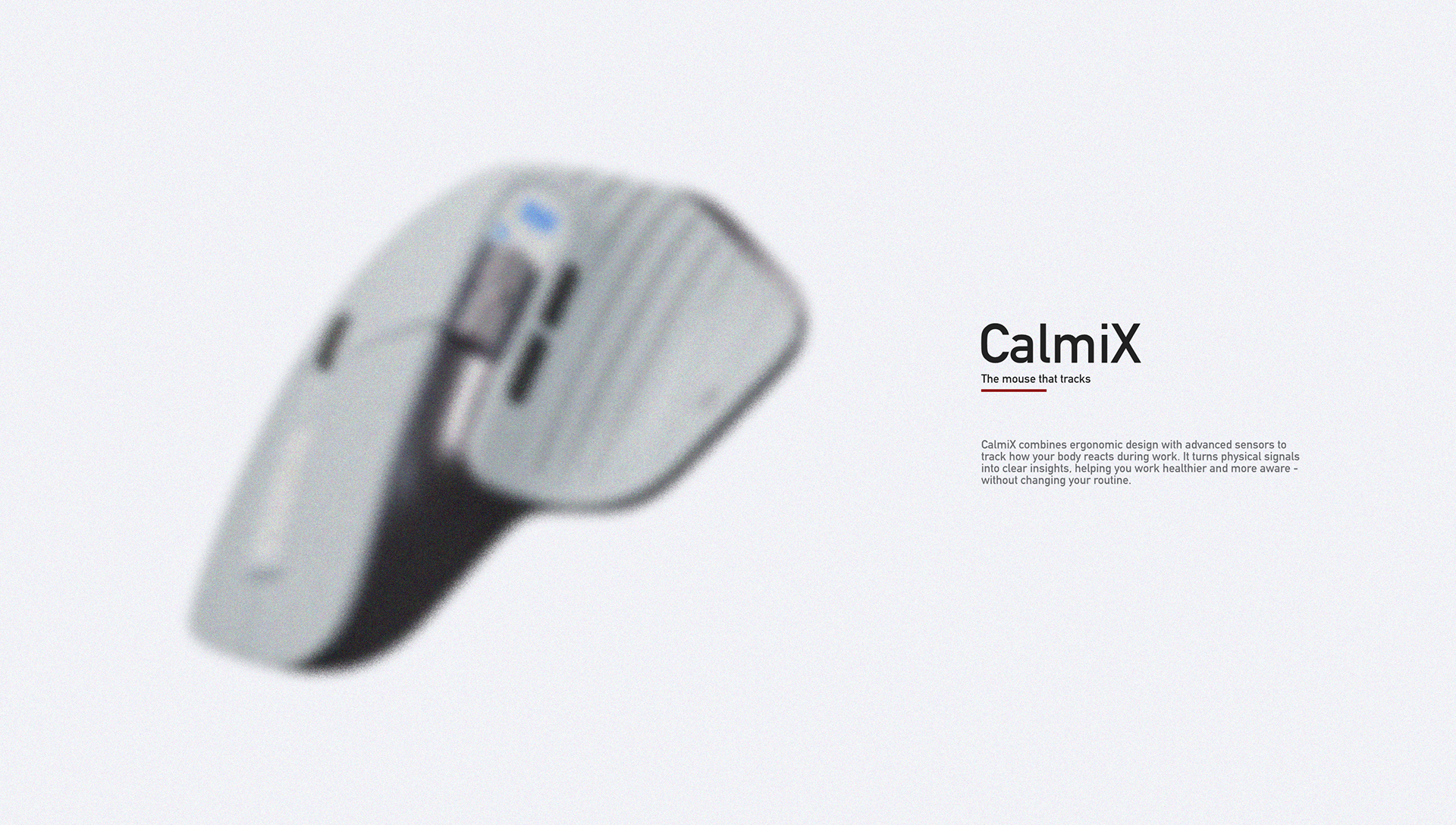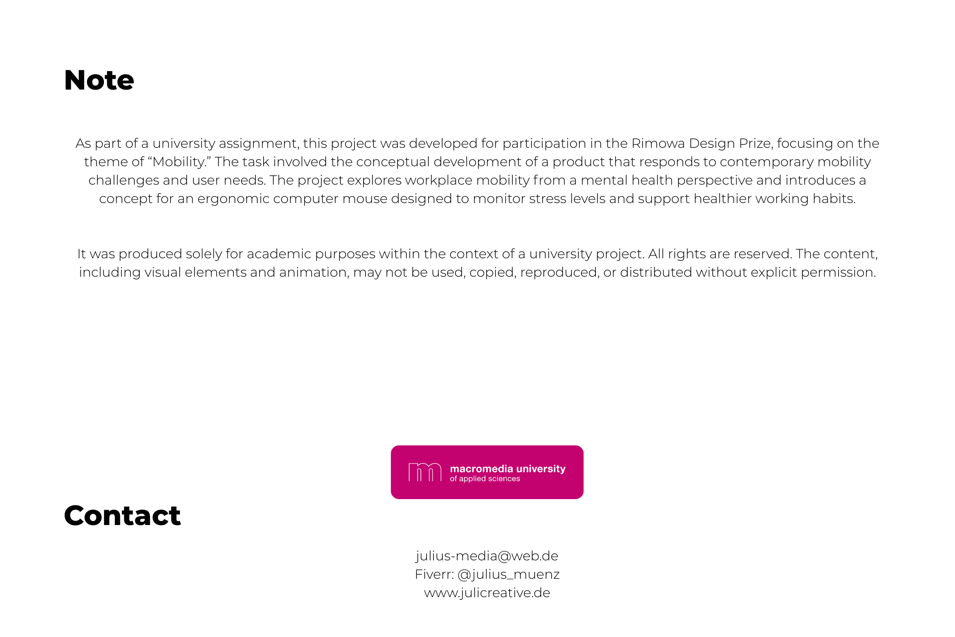 This interdisciplinary project was developed for the RIMOWA Design Prize under the theme “Mobility.” The concept explores workplace mobility from a mental health perspective and presents an ergonomic mouse designed to monitor stress levels and support healthier working habits. The project combines user research, conceptual development, 3D modeling, and prototype-oriented design to address well-being in modern work environments.
