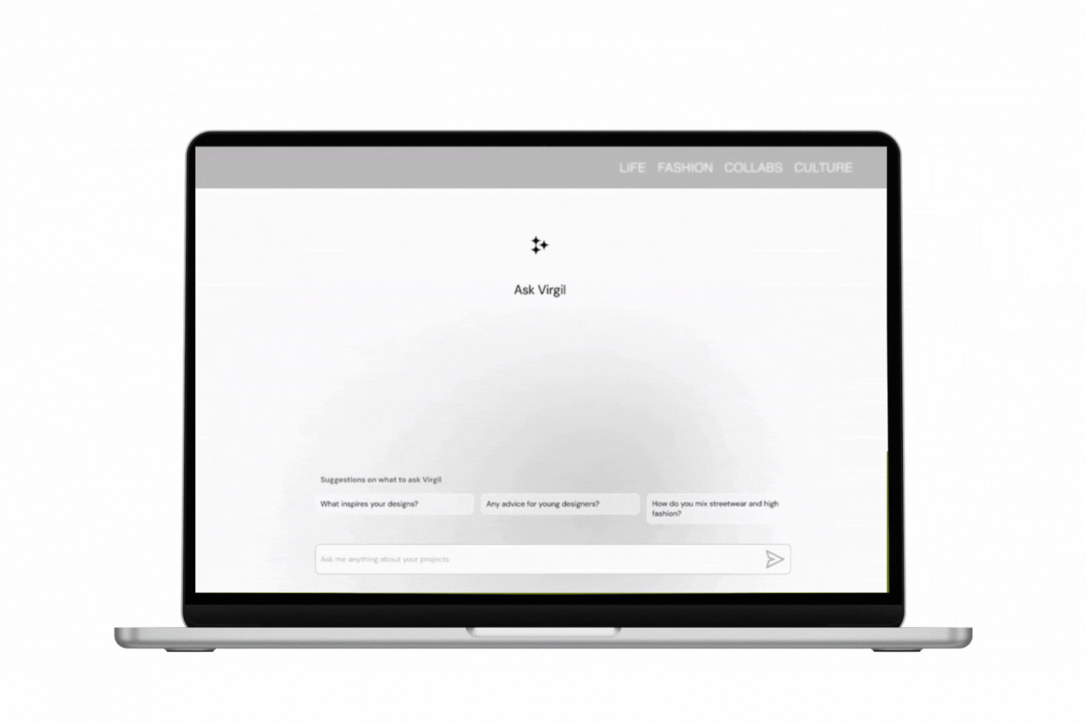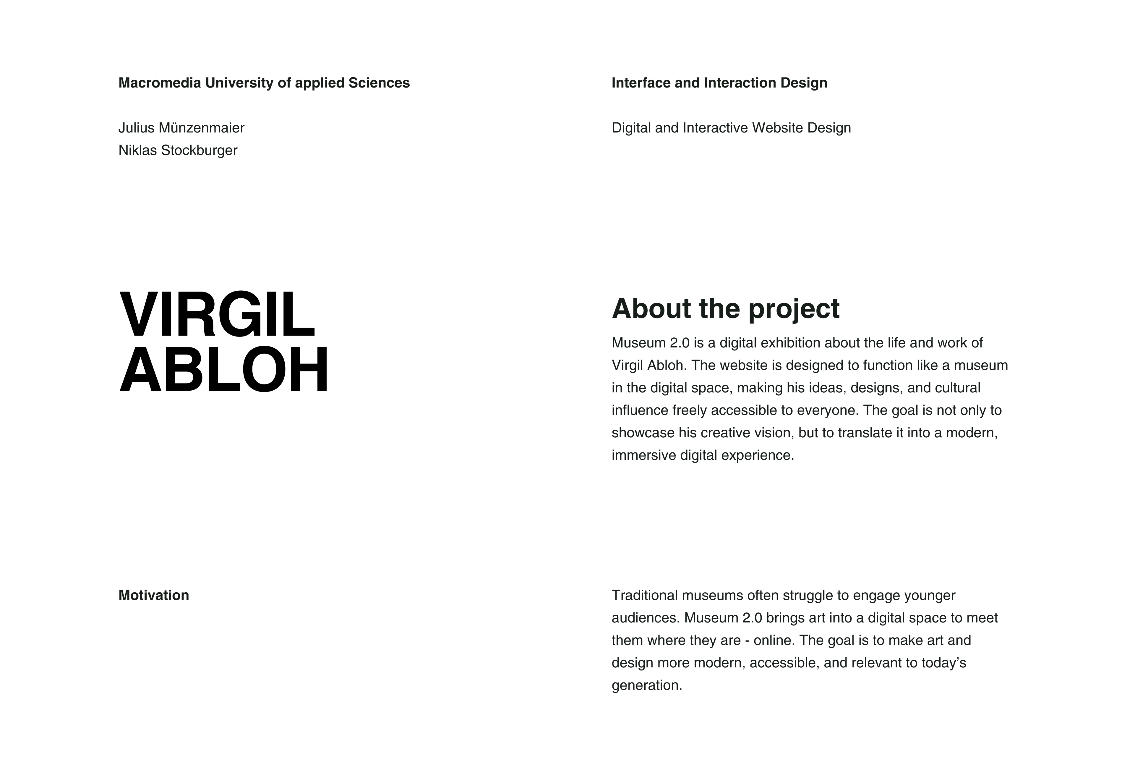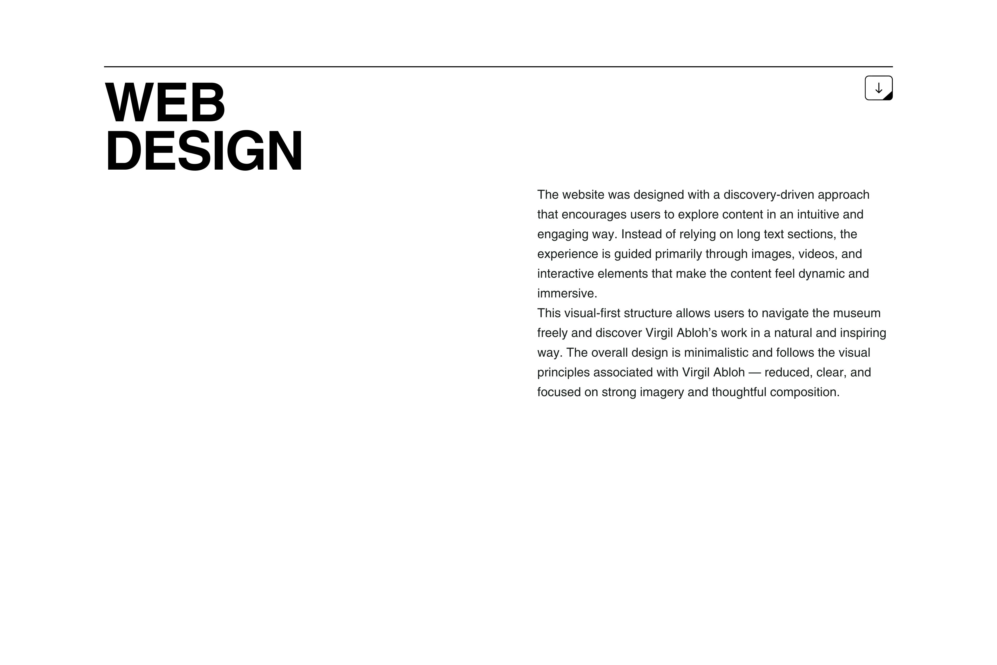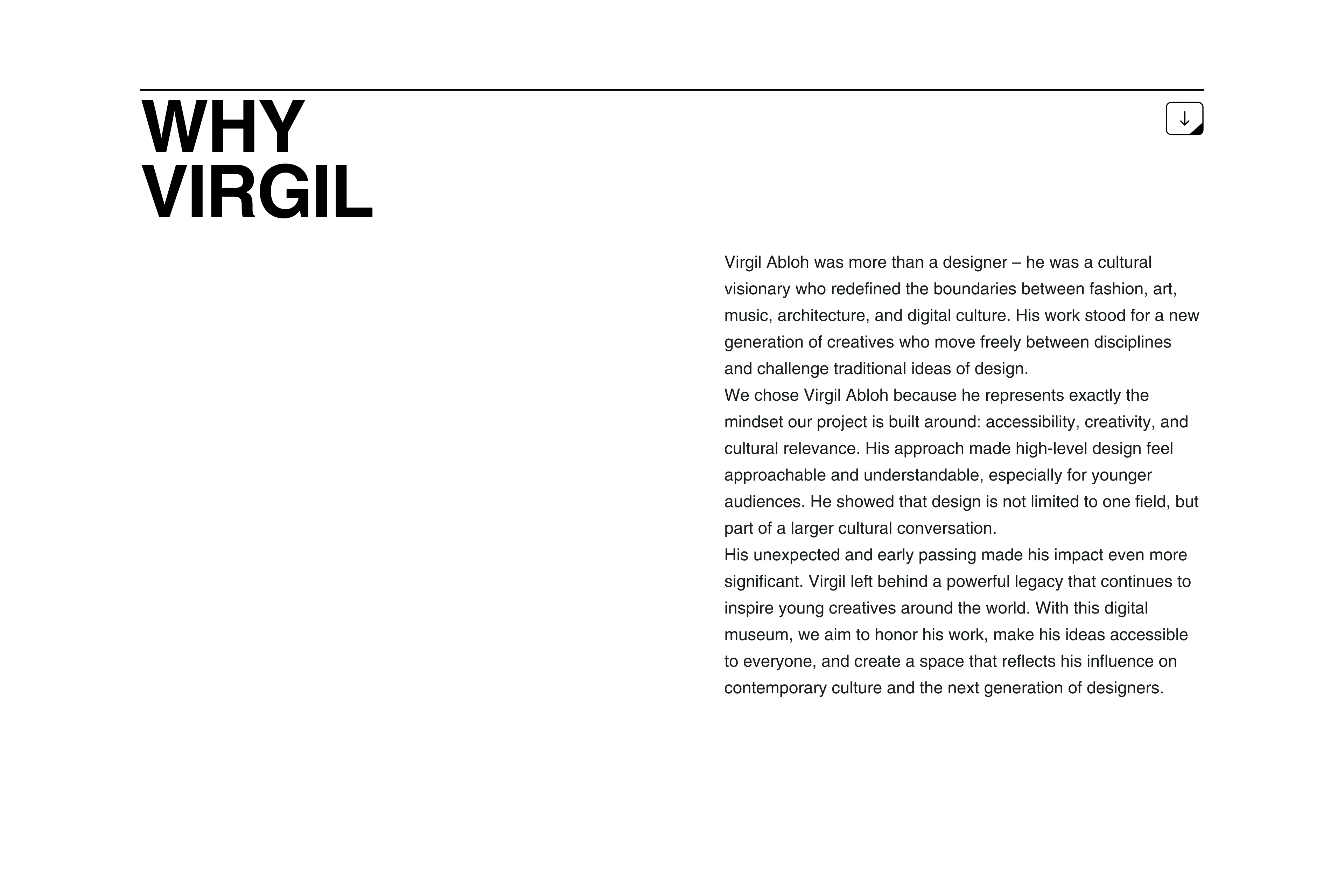 An interactive digital museum experience dedicated to Virgil Abloh, designed as a UX/UI case study. The project focuses on a discovery-driven user journey, combining minimal visual design with rich media, interactive elements, and a fully clickable high-fidelity prototype created in Figma.